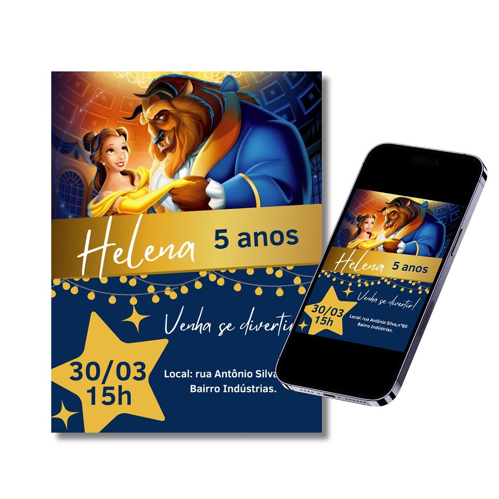 Convite de Aniversário A Bela e a Fera Azul e Dourado